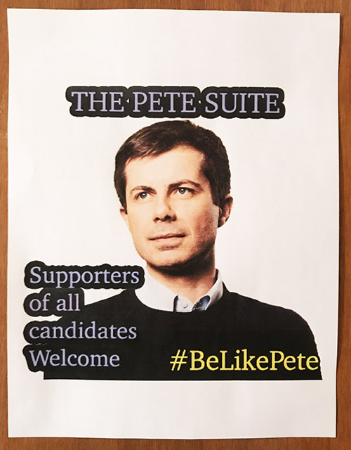 That was February. And I thought, “No chance.” Cut to our Christmas party last week. I broke down my art studio and re-dubbed it “The Pete Suite,” covering the walls with Buttigieg pictures, stickers and yard signs, leaving my “Binder Full of Pete” open like it was a Bible on an altar. As I made up the personalized Pete Buttigieg drink coasters, I has to ask myself, “Who AM I?”